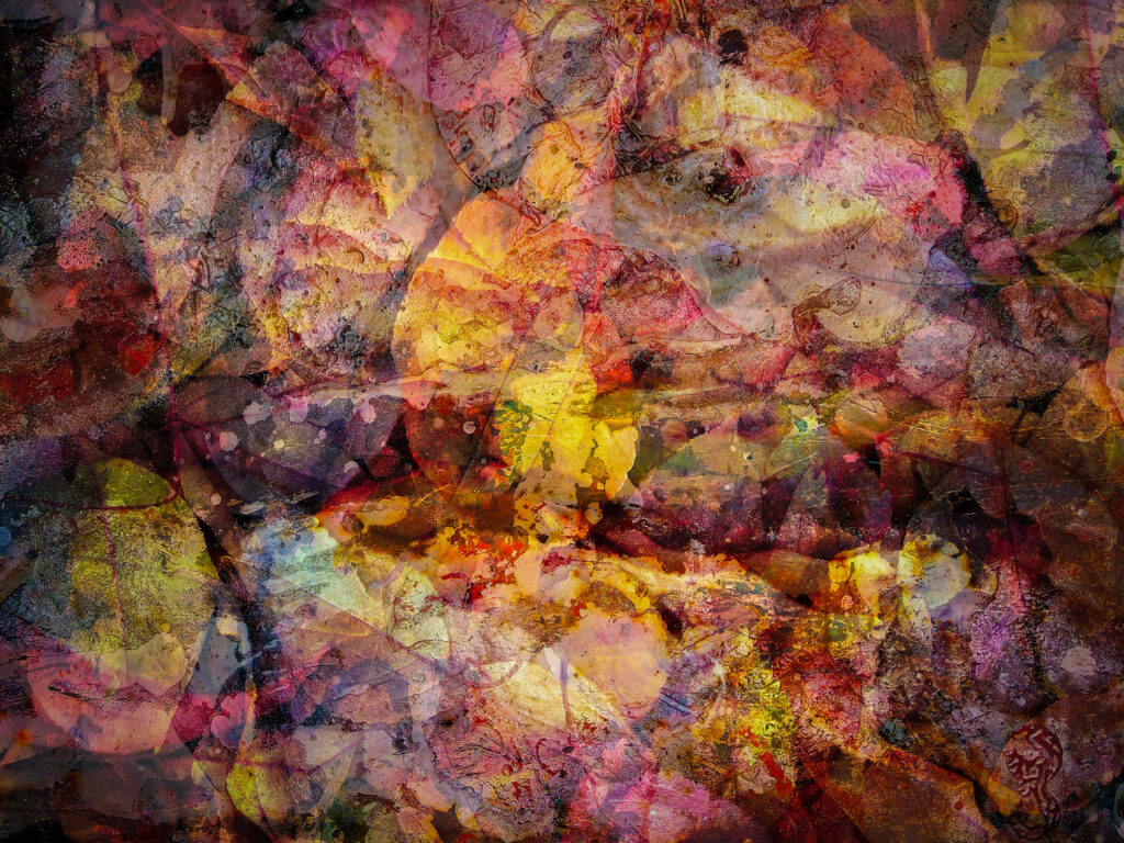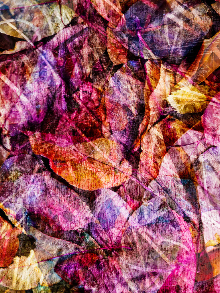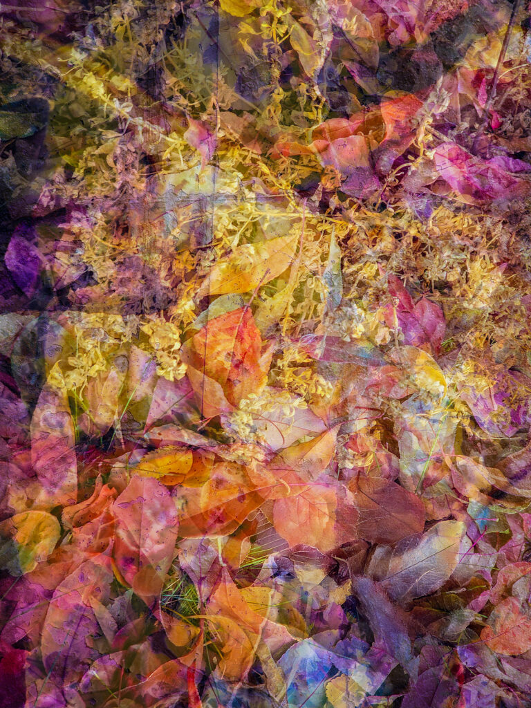 Samsung Galaxy S23 Ultra images of fall leaves and detritus taken in a quiet spot in my yard on a shockingly windy day. Multiple exposures made in camera and then tweaked in Photoshop with textures I have photographed over the years. They were layered on top in various blend modes for shits and giggles.